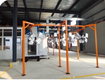 水帘涂装室有助于简化,但现在多用于喷涂设备生产线。 水帘涂装室的前面是水帘板,水帘板的上面有溢流槽,施工中工件从悬挂运输链送到涂装室。 操作者用手持式静电喷枪或固定式旋转杯喷枪涂装工件时。